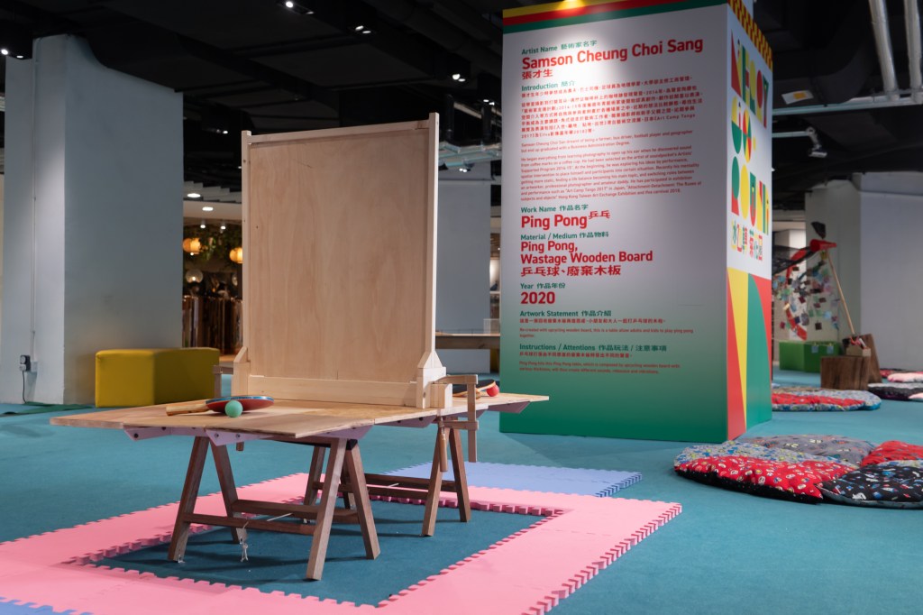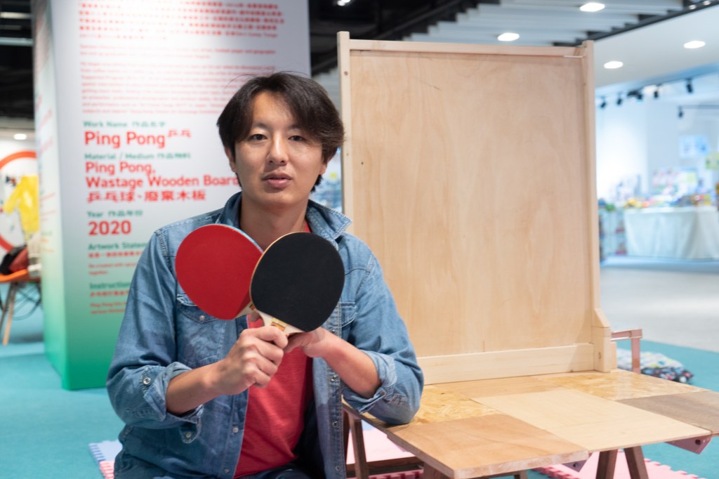 Samson Cheung Choi Sang is an artist and professional photographer. Initially known for his experiments with performance, Sang’s recent work focuses on life balance. He brings Ping Pong to “Merry-Go-Round” – an upcycled wooden board that has been given a new life as a ping-pong table meant for kids and adults to play with together as they observe different sounds.