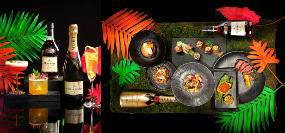 Ozone Bar Manager Oscar Mena has created three exclusive cognac-based cocktails made with Hennessy V.S.O.P, a harmonious and well-structured cognac with a remarkably lasting finish. A variation of the classic sidecar with Hennessy V.S.O.P, Cointreau, fresh lemon juice, and mint leaves, Green Jungle is a well-balanced concoction with a subtle touch of sweetness. Inverted Bubble Falls, served in a champagne glass and lined with a twisted orange peel, is built with cognac, St Germain elderflower liqueur, a sugar cube dipped in vanilla bitters and topped with Moët & Chandon champagne. This bubbly cocktail is very easy to drink. Last but not least, The Highest Forest, shaken and strained into a coupette glass, is undoubtedly a ladies’ favorite. The fruity, summery cocktail contains Hennessy V.S.O.P, fresh raspberries, and fresh lemon juice. Light and refreshing on the palate, the Luminous Jungle cocktails perfectly complement both sweet and savory dishes from the food menu. Looking to drink straight out of the bottle? Simply upgrade your package to enjoy free-flow champagne and cocktails.