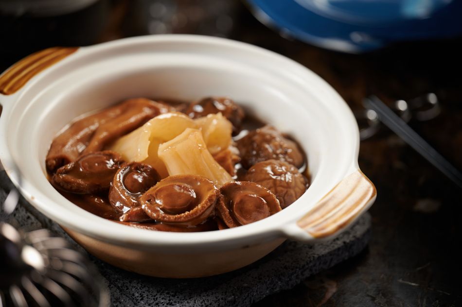 During this time, the snow white shiitake is slowly braised with abalone sauce. When it comes time to assemble the ingredients, sheets of fried beancurd skin are spread around the claypot and then topped with goose web, fish maw, shiitake mushrooms and abalone. Brimming with smooth and soft fish maw and mushrooms, delectable goose web and abalone and the fragrant sweetness of Jinhua ham and pork, this bountiful claypot is a must for those looking for a nourishing wintertime feast.