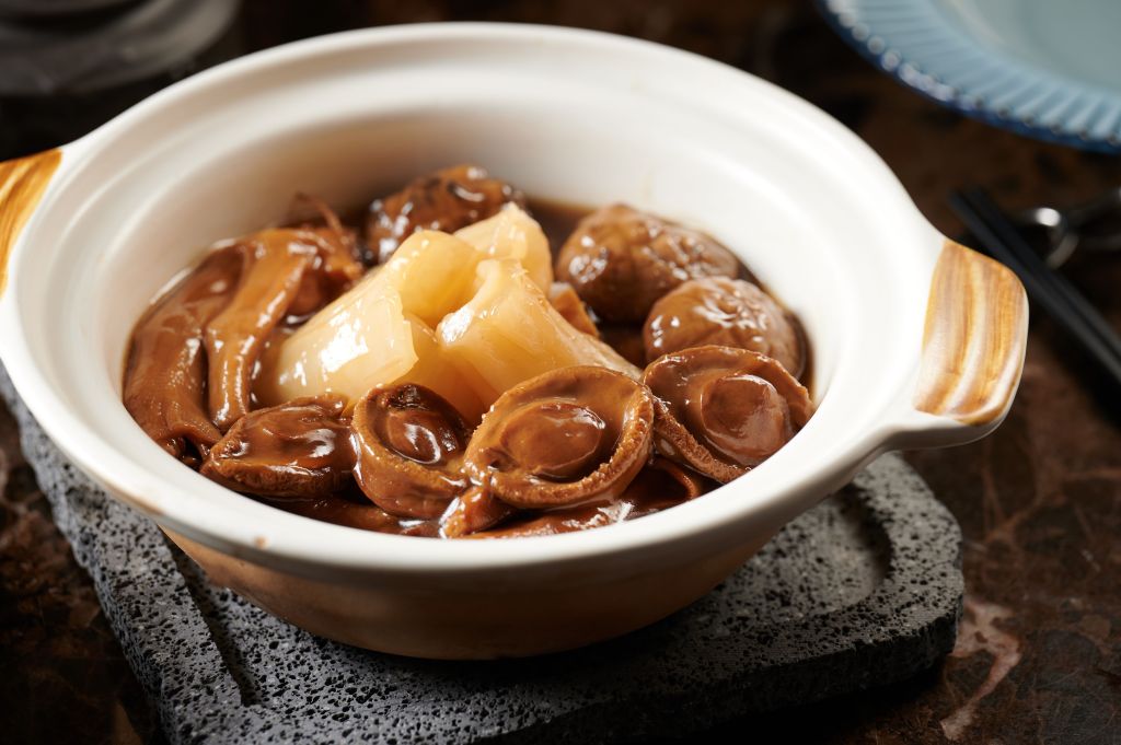 Chef Tsang has also created the lavish Braised Goose Webs with Shredded Fish Maw and Sea Cucumber in Abalone Sauce (HK$988) featuring four pieces each of goose web, fish maw, Japan snow white shiitake mushrooms and South African abalone (16-head). Preparation of these expensive ingredients takes time, skill and effort: the fish maw is first baked for several days until soft and is then boiled in ginger juice with abalone sauce added until it soaks up the flavours. Meanwhile, the goose web and abalone are separately stewed over low heat for three to four hours with a superior stock made from Jinhua ham, old hens and lean pork.