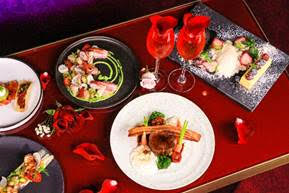 Introducing our Mexican-inspired Surf and Turf, the 5-course menu offers three appetizers to share between the love birds. The Mini Beef Tartare Tacos composed with beef tartare and egg yolk, whilst the Yuzu Ponzu brings an unparalleled balance of sweet and savory. Warm up your stomach with the rich and savory Lobster Bisque and let our Ceviche de Pescados freshen you up. Building up the Surf & Turf experience, guests can choose to enjoy juicy chargrilled USAD Beef Tenderloin or the Miso-glazed Alaskan Black Cod, complemented with edamame and sweet corn. Other Mexican offerings include Shrimp Enchiladas and Vegetarian Burrito Rolls. Finish off your meal with chef’s special Flaming Dark Chocolate Fondant and Yuzu Cheesecake, not only looking good on the plate, but this platter will surely end your date right. This menu comes with a bottle of Chateau d’Esclans Whispering Angel Rose 2019.