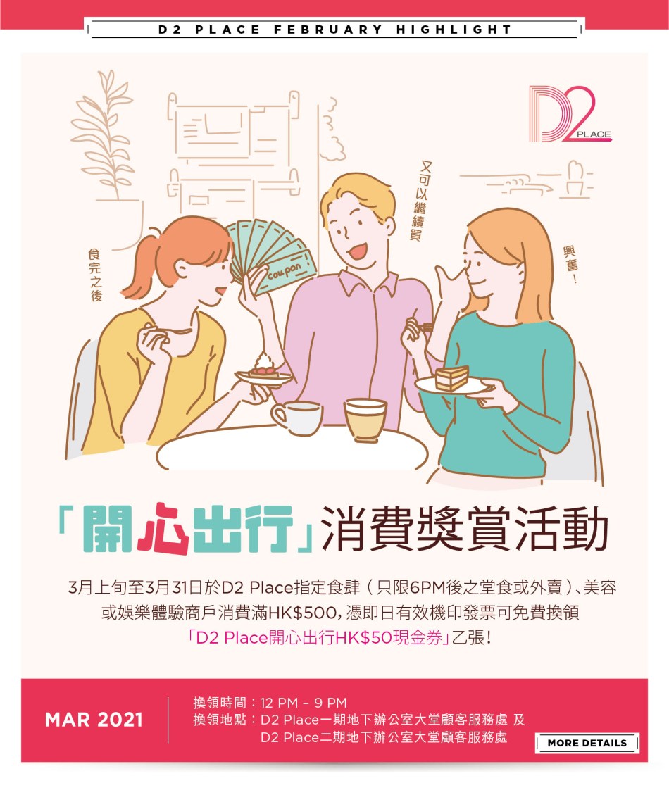 Coupons to use at D2 Place – http://www.d2place.com/happyhangout?utm_source=d2place&utm_medium=edm&utm_content=mar2021